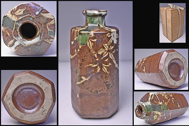 > 作者不明 ★ 鉄釉 紅葉文 面取 花瓶 ★ 鉄釉に抜きの紅葉が美しく青差しの釉景が味わいのある逸品 ★ 民芸陶 ★ 村田元 氏の箱(合わせ箱)