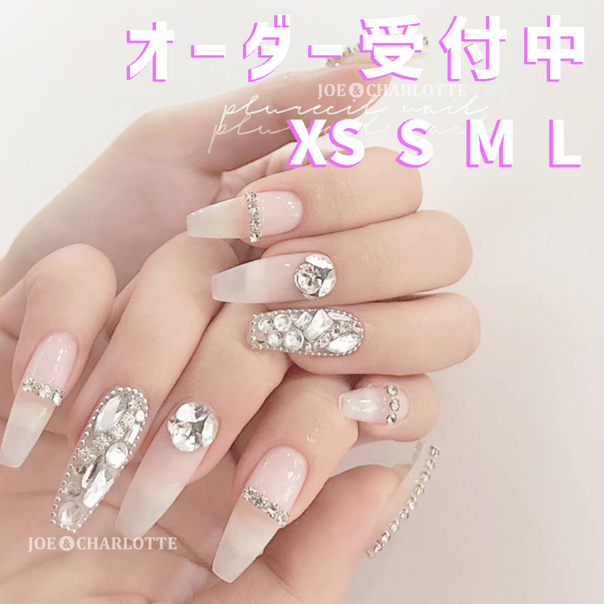- No.09 ジェルネイルチップ ビジューチェーン ラメ クリスタル埋め尽くし 白 m