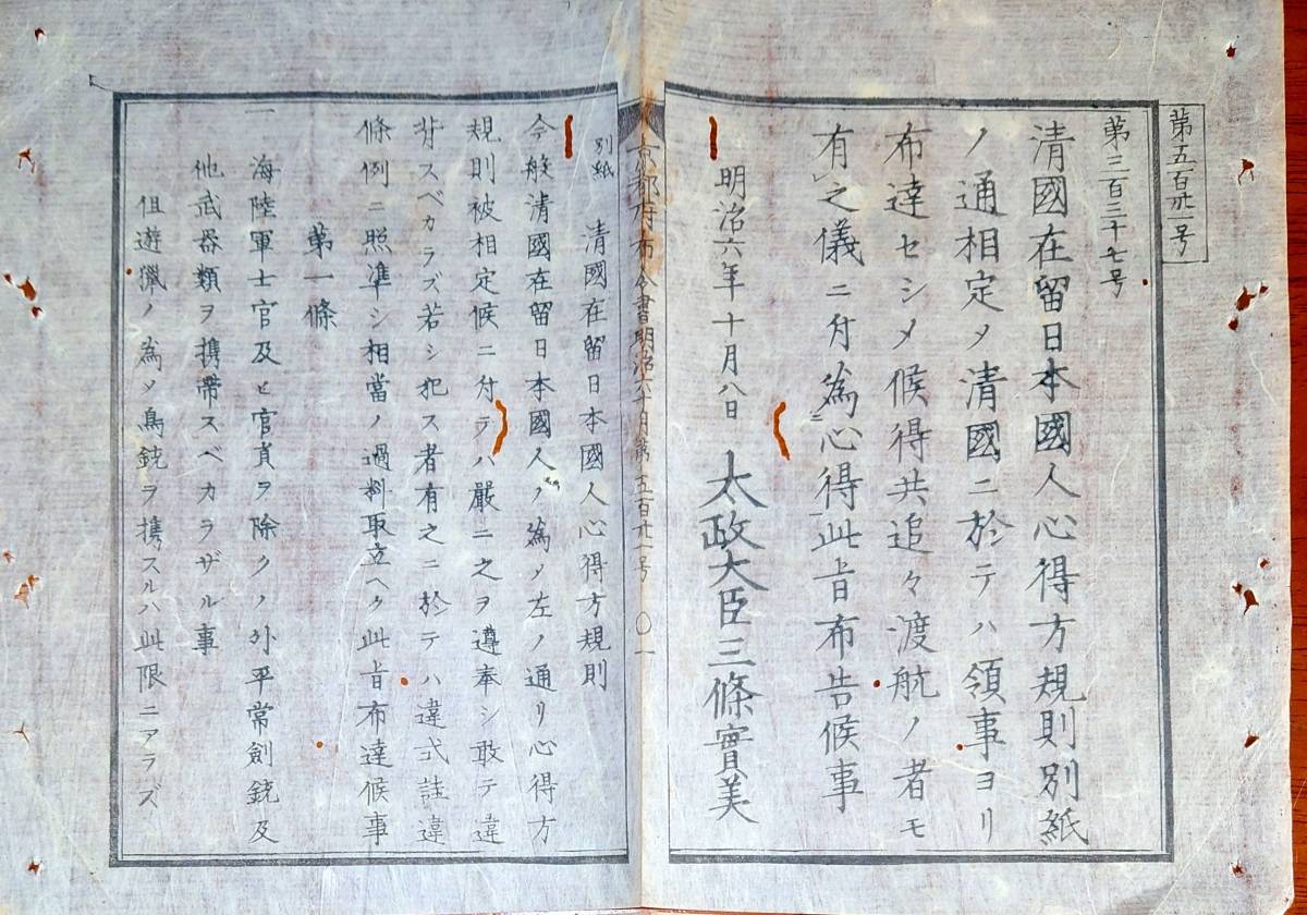 - f23011901〇明治布告布達 清国在留日本国心得方規則 第1条~第13条 明治6年 京都府御布令〇和本古書古文書