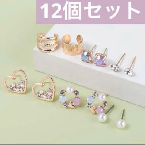 - ミルキーカラー ハート フェイクパール ビジュー ピアス カフ 12個セット
