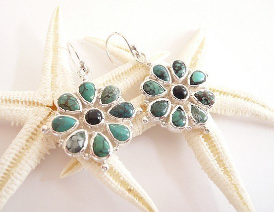 - ★ 奉仕品 ★ 即決 SV925 ピアス 花型 オニキス & ターコイズ A3