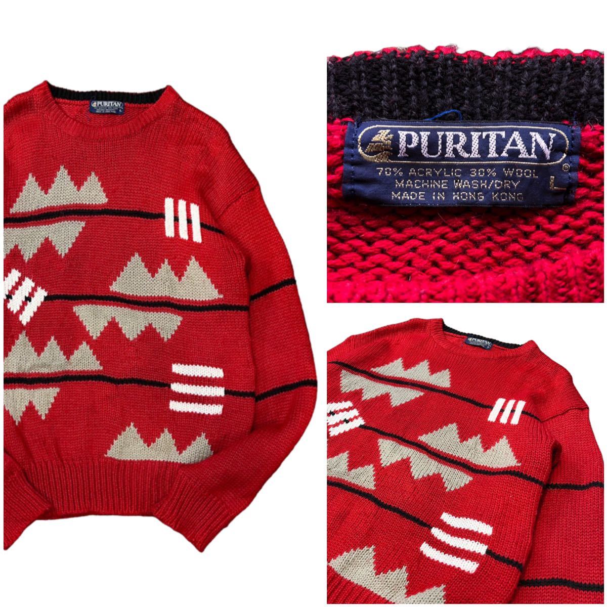 - 80’s〜 PURITAN ピューリタン ヴィンテージ セーター Lサイズ アクリル ウール ニット 赤 レッド 柄 クルーネック ボーダー インナー
