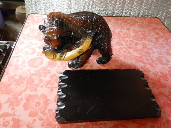 > アイヌ木彫 ヒグマ 鮭 北海道木彫置物010701 33X21H20CM 台35.5X20.5H2.5CM 日本製MADE IN HOKKAIDO JAPAN AINU民族 コタン カムイ