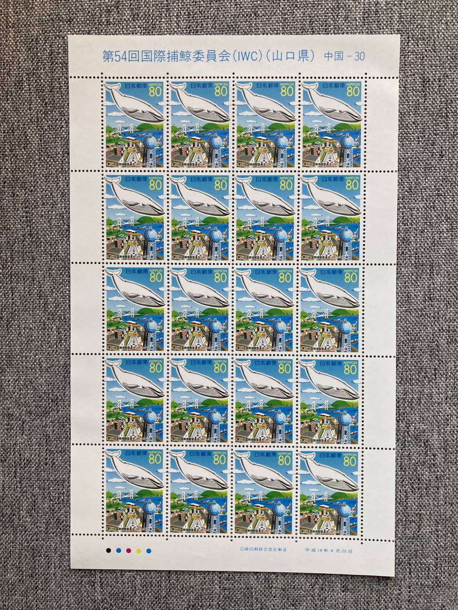 > ★未使用 ふるさと切手 第54回 国際捕鯨委員会 IWC 山口県 下関の風景 シロナガスクジラ 平成14年 2002年 切手シート 80円 20枚 日本郵便