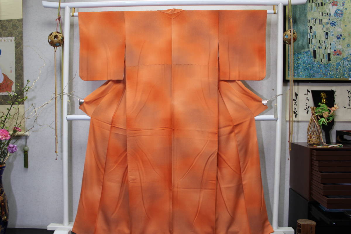 > きもの今昔4798 色無地きもの 正絹紋意匠生地 広衿袷仕立て 柿色にやや濁りを入れたグラデーション 身丈163cm