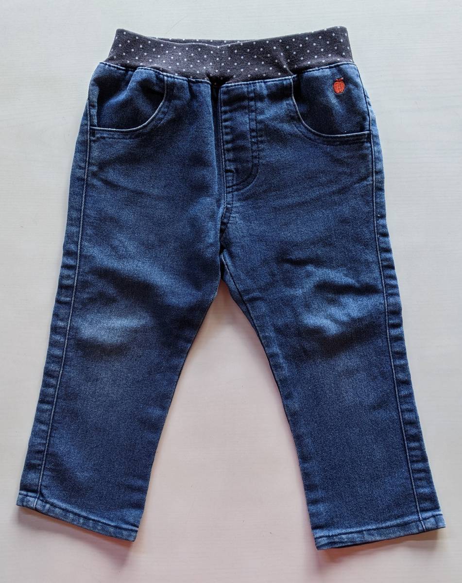 - 〈タキヒョー〉 長ズボン 90cm ウエストゴム 柔らかジーンズ生地 水玉柄・リンゴ刺繍