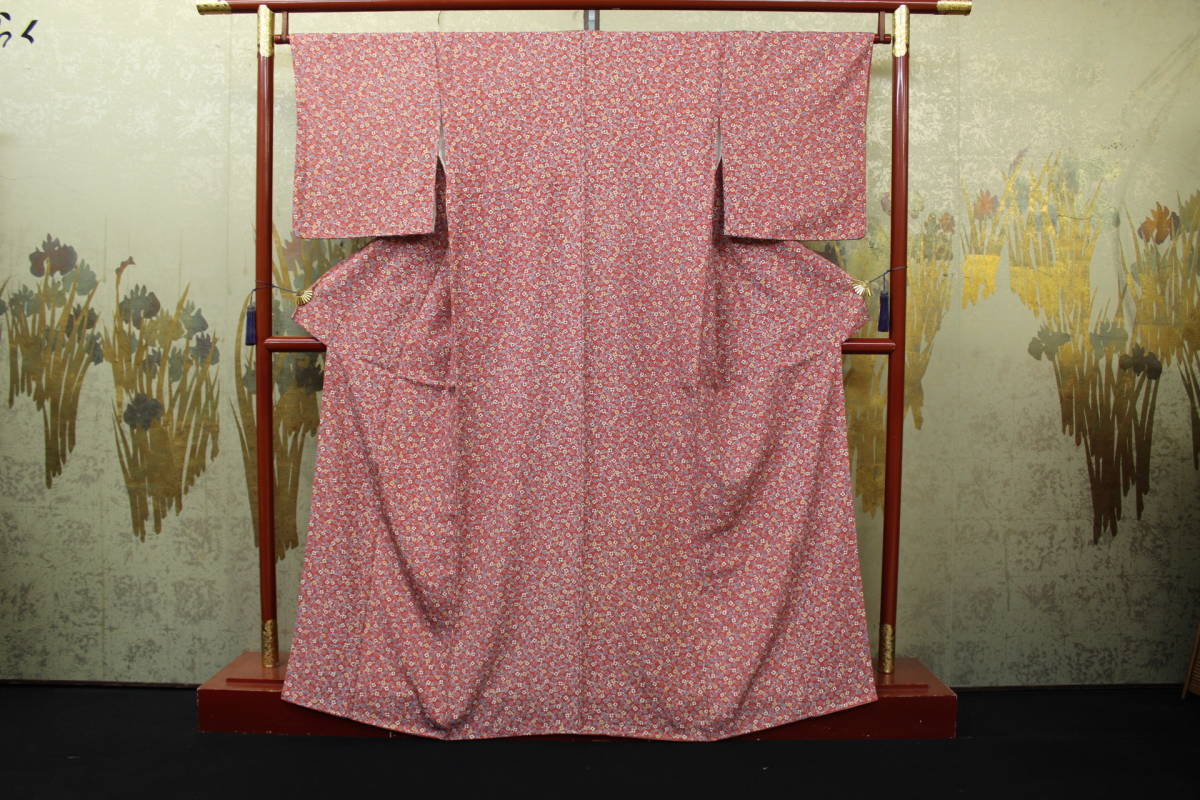 - きもの今昔4839 小紋のきもの 正絹丹後ちりめん一越地 薄紅色に四つ葉のクローバー柄 シツケ糸付き未使用 身丈161cm