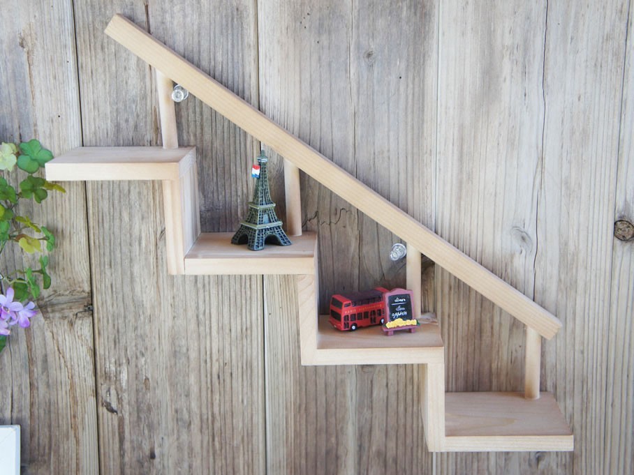 階段のかたちが可愛い壁掛けのシェルフです。グリーンやお気に入りの小物を飾って。。。一つあるだけでお部屋の雰囲気がイメージアップ。ミニサイズなので小さい雑貨を飾るのにぴったり。(サイズを確認ください)お手軽に素敵なインテリアの出来上がりです♪画像ではプッシュピンで留めていますが専用の金具がついています。※商品の特性上、稀に小さなキズ・塗装ムラ・木のフシなどがある場合もございます。ご了承下さい。【サイズ】315×75×265(mm)【素材】木製