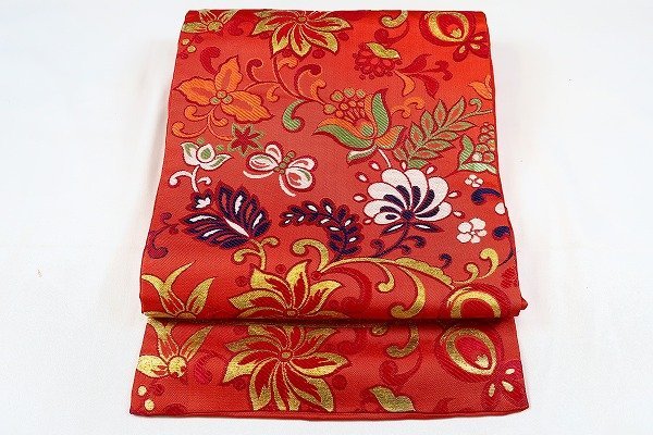 - 【着物フィ】アンティーク 名古屋帯 レンガ色 唐花 大正ロマン レトロ お洒落 正絹 13278