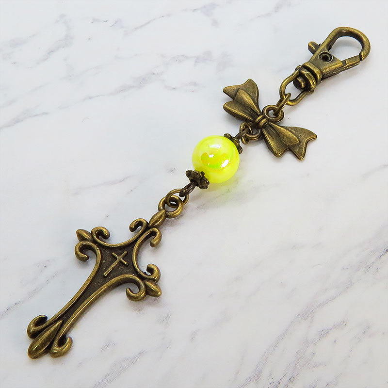 - アンティークゴールド ロザリオ・リボンにミックスイエローのビーズのファスナーチャーム キーホルダー 金具変更可