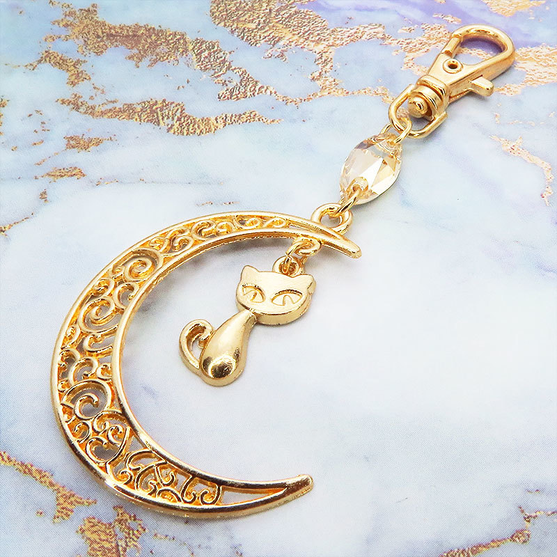 - マットゴールドの猫モチーフと透かし三日月のキーホルダー スワロフスキー・クリスタル(ゴールドシャドー) 金具変更可