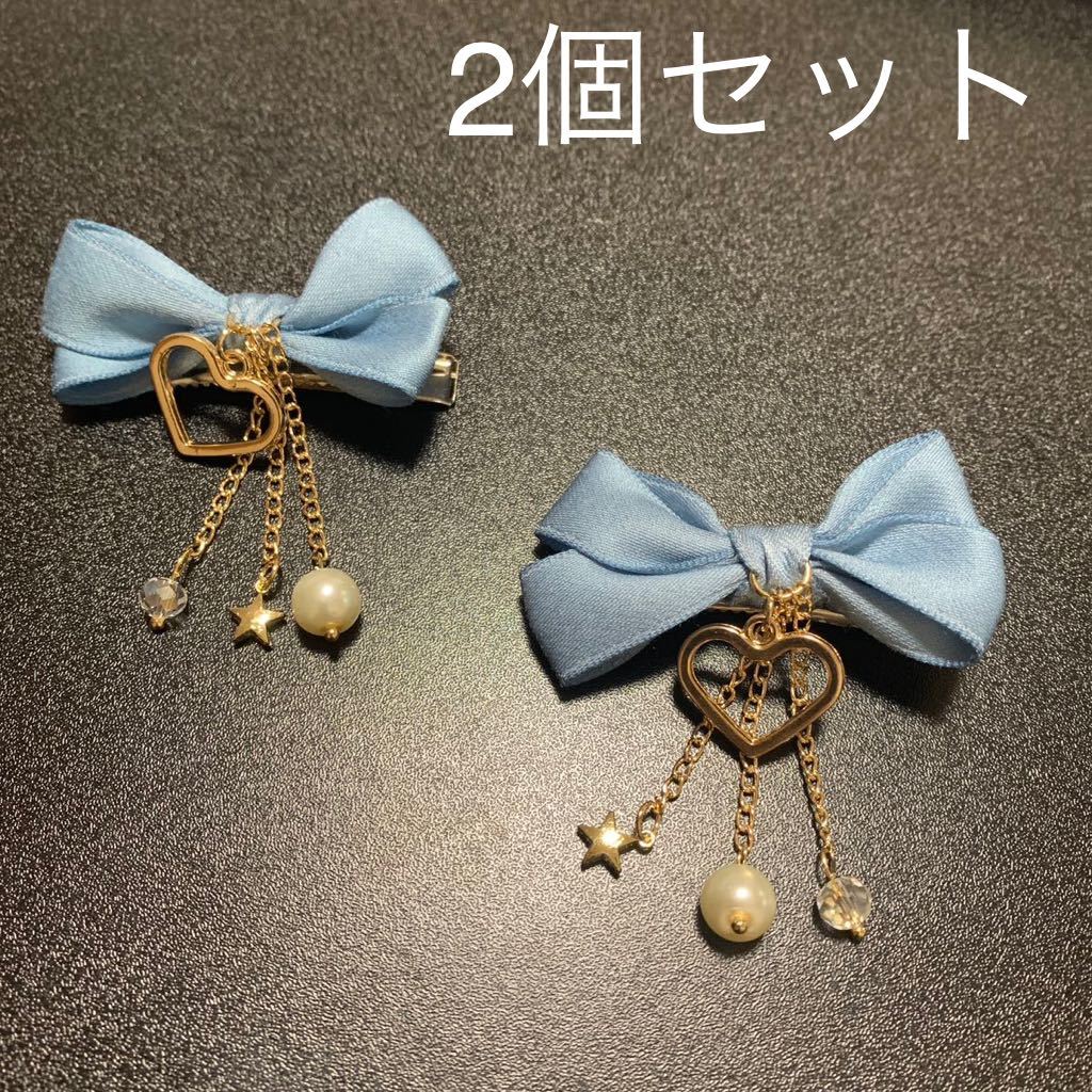 - 揺れる チャーム付き ブルー ハートリボン 量産型 ヘアクリップ 2個セット