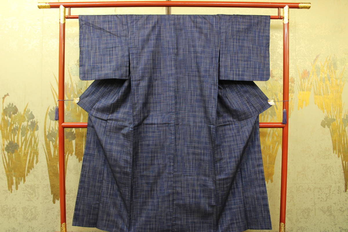 > きもの今昔5060 紬の単衣きもの 広衿共布居敷当て付き 濃紺色横ぼかし風絣入りに縦には雨縞柄 身丈146cm