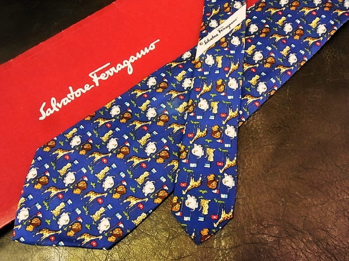 > ★並品★4R01317【Ferragamo】フェラガモ「象 ライオン キリン ヒョウ 動物 旗 柄」ネクタイ