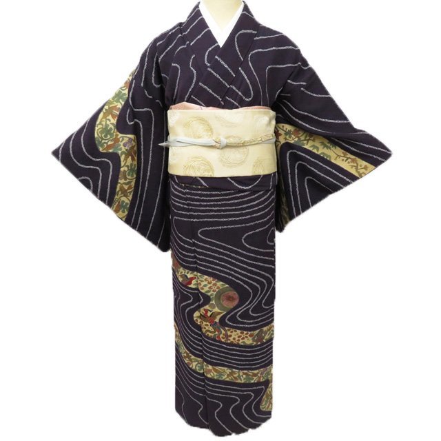 > ★きもの北條★ アンティーク 花鳥の図 流線模様 個性豊かな逸品 滅紫色 多色 着物 訪問着 A805-4 SA 【中古】