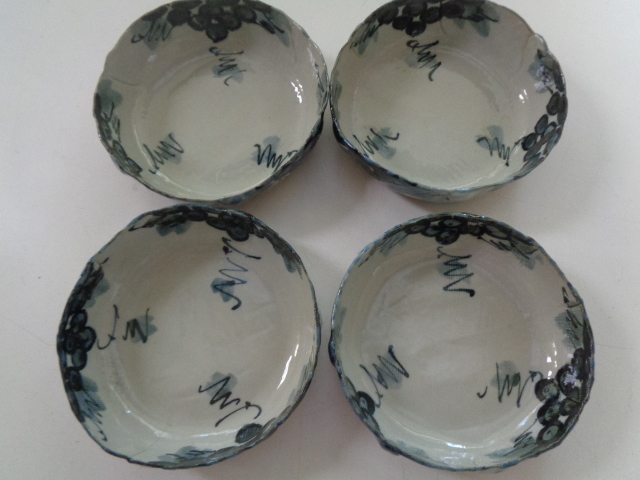 - c487-60 小鉢 在銘 葡萄図 手描き染 4客セット 懐石道具 茶懐石 アンティーク