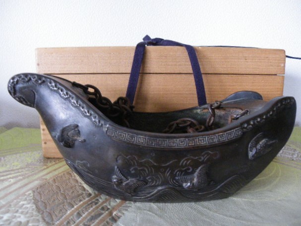- 243.銅花器 生け花 彫刻 波 鳥 在銘 中古