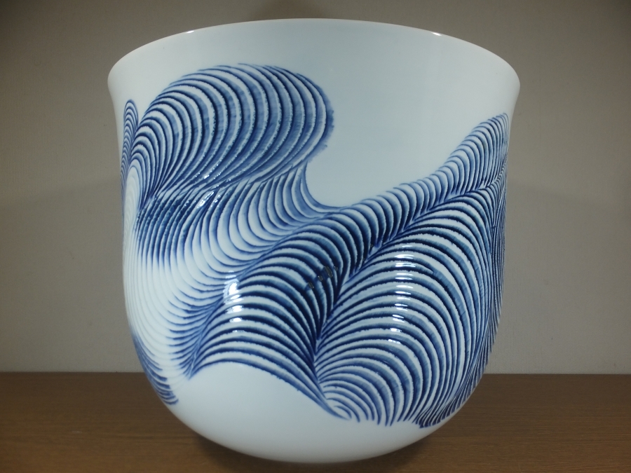 > 【真作保証】 藤井朱明 自作 大作 31㎝ 紋 白磁潮彫花器 稀少 佐賀美協展出品作 朱明窯 人気作家 日展会友 佐賀美術協会々員 佐賀県