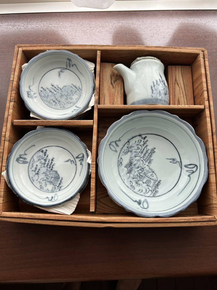 > ★和食器★古染山水漬物揃★アンティーク★大→1枚★小皿→5枚★醤油入れ→1個★長期保管品★厚地★高級感★