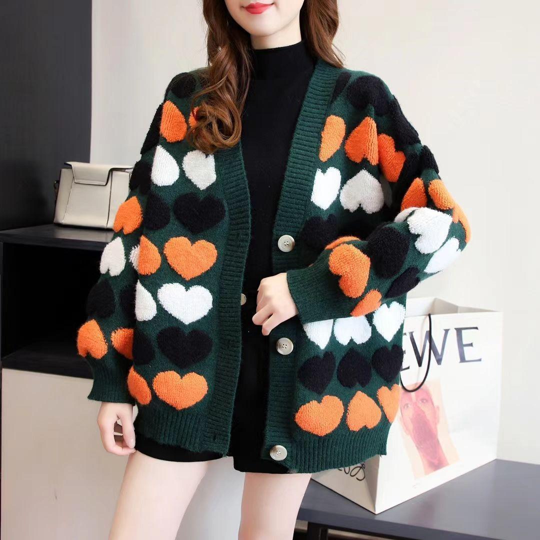 - 【グリーンハート柄 ★2XL】秋冬あったか太ニット カーディガンおしゃれ