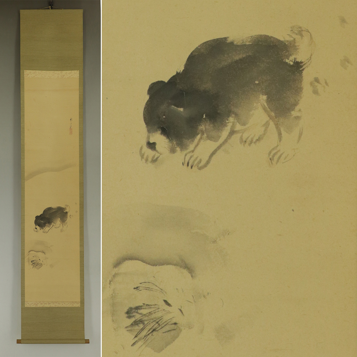 - 【真作】川端春翠【雪中狗子図】◆紙本◆共箱◆掛軸 t03125