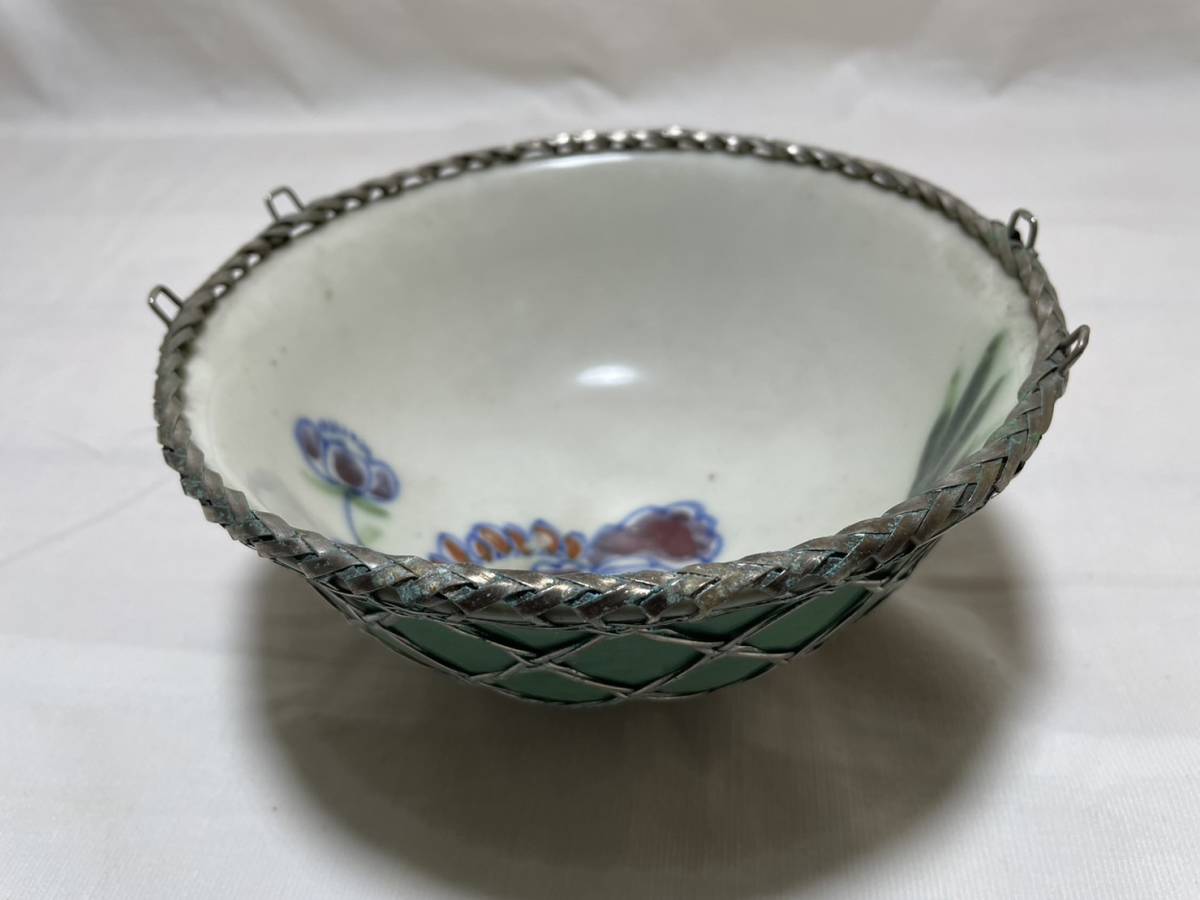> ・ 古い器 ★ SZ12 日楽 レア 鉄籠 籠編 菓子鉢 フルーツ入れ 磁器 陶器 骨董 昭和モダン レトロ