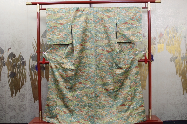- きもの今昔5725 合繊のきもの 広衿袷仕立て ポリエステル100%みどり基調山野風景柄 身丈158cm