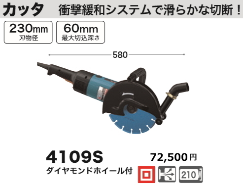 マキタ カッタ 4109S ダイヤモンドホイール付 定価72,500円(税別) ■衝撃緩和システムで滑らかな切断 ・刃物外径230mmx内径22mm ・最大切り込み深さ60mm ・回転数6000回転/分 ■付属品 ダイヤモンドホイール(A-31170) エルボジョイントセット品 ロックナットレンチ35 スパナ22