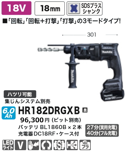 > マキタ 18mm 充電式ハンマドリル HR182DRGXB 黒 18V 6.0Ah 新品