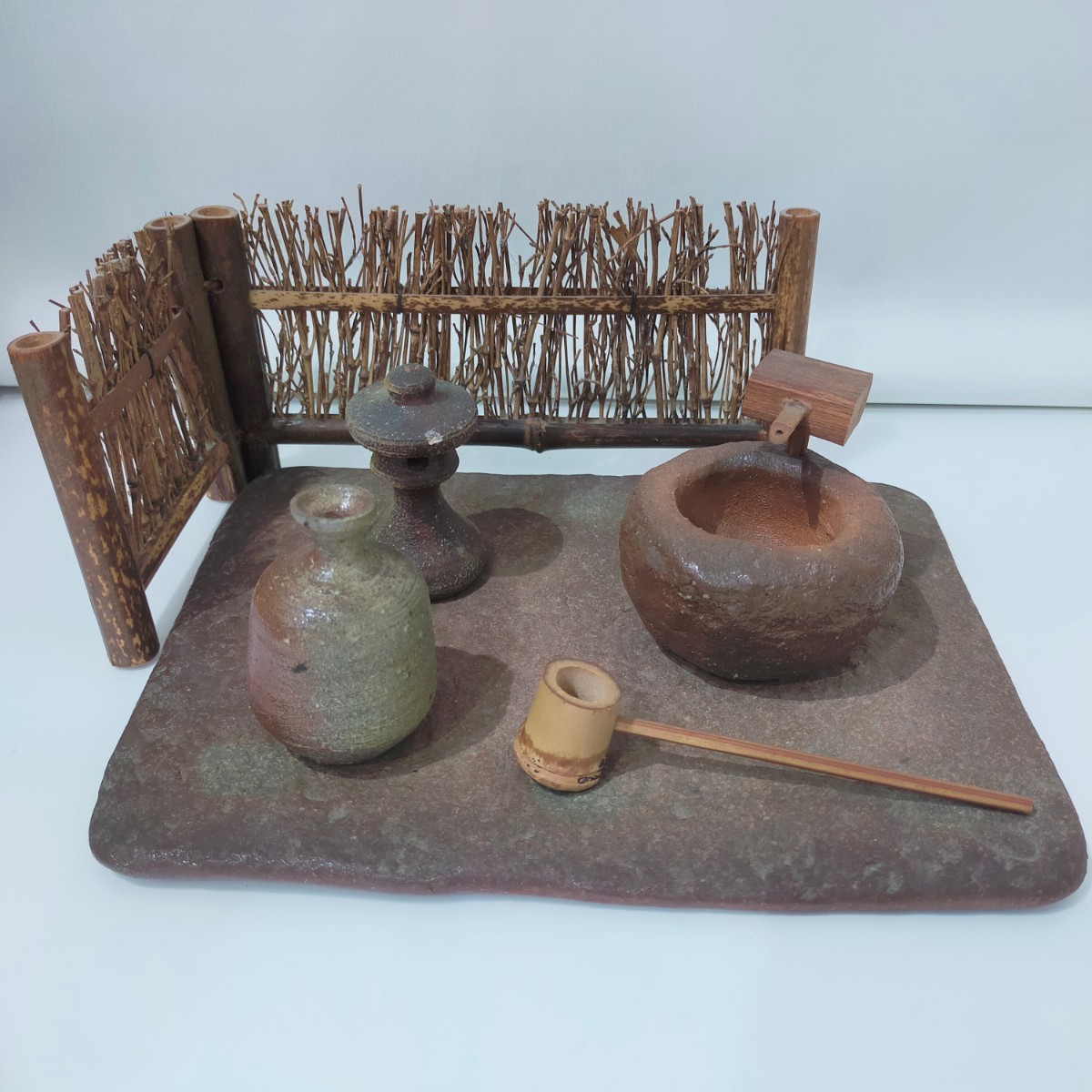 - ★USED品★備前焼 ミニチュア 坪庭 手水鉢 柄杓 灯籠 セット