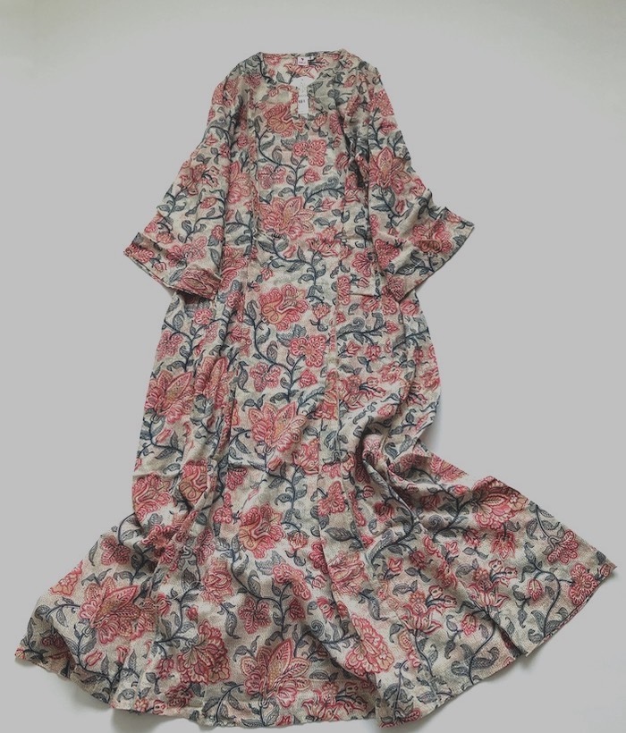 - Sale♪新品 Kilol◆Jaipur ブロックプリント ボタニカルフラワーフレアロングワンピース カフタンドレス INDIA 手染め