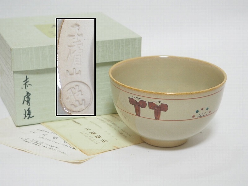 - A1981 赤膚焼 三代 大塩昭山 作 奈良絵 茶碗 紙箱付 ☆ 茶道具 茶器 抹茶道具 茶懐石 茶事 抹茶碗 陶器 作家物 在銘 陶印 美品 良品 無傷