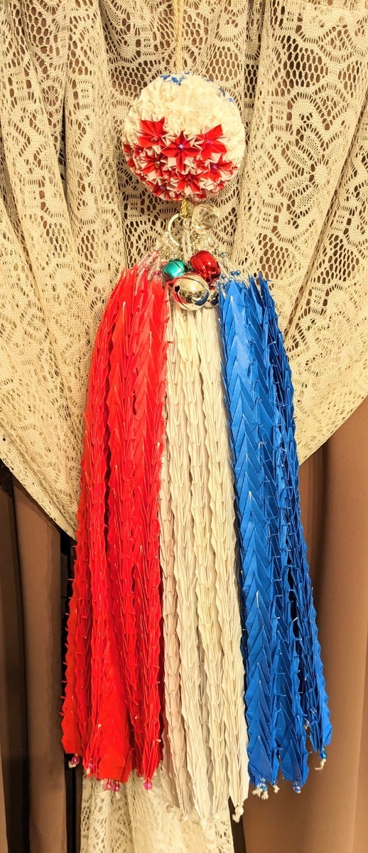 - トリコロールカラー!くす玉☆千羽鶴☆千羽鶴はカニカンフックで着脱可~赤青銀の御鈴が5つ♪☆願成就☆縁起担ぎ☆幸福☆パリ☆プレゼント