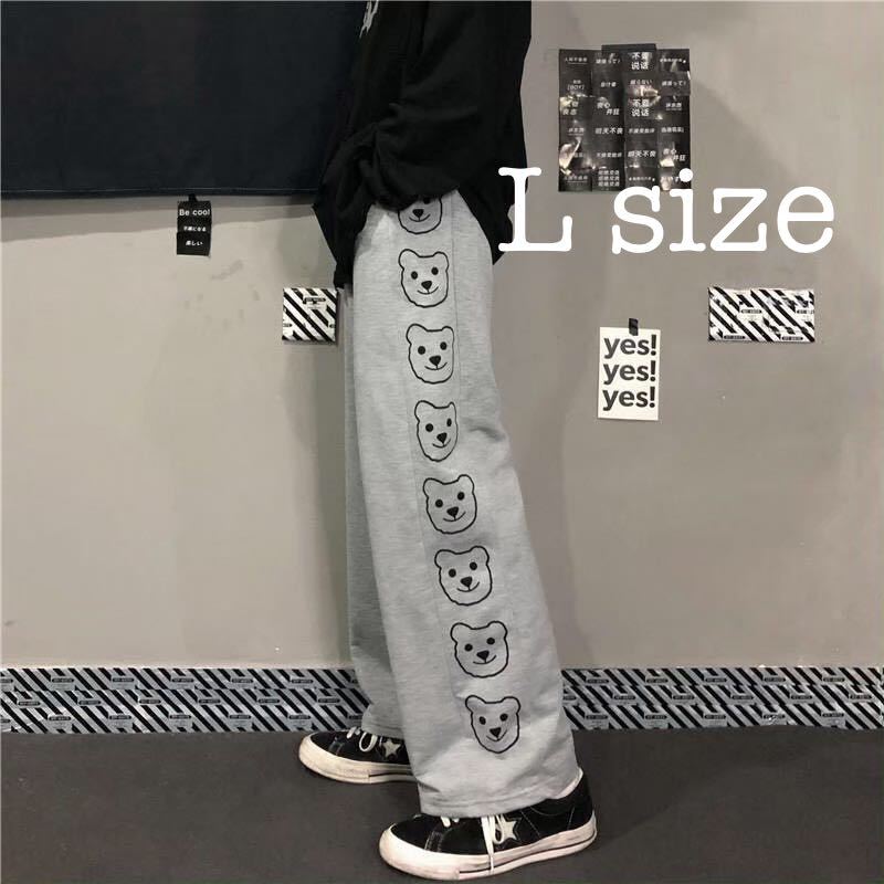 - ワイドパンツ イージーパンツ くま ボトムス ワイドレッグパンツ グレー L