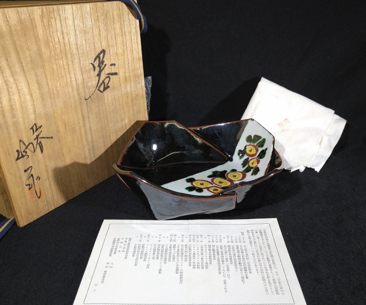 - 松本佐一 「器」 色絵 果物文 22cm 菓子鉢 共箱 共布 菓子器 茶道具 九谷焼 県無形文化財保持者 btr-大11a3225
