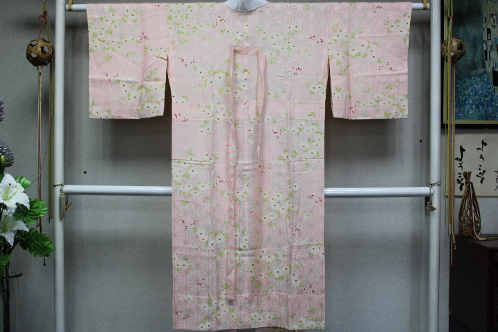 > きもの今昔6065 長襦袢 バチ衿単衣仕立て 正絹綸子地麻の葉地模様 淡いピンク地色に菊の小花模様 身丈126cm