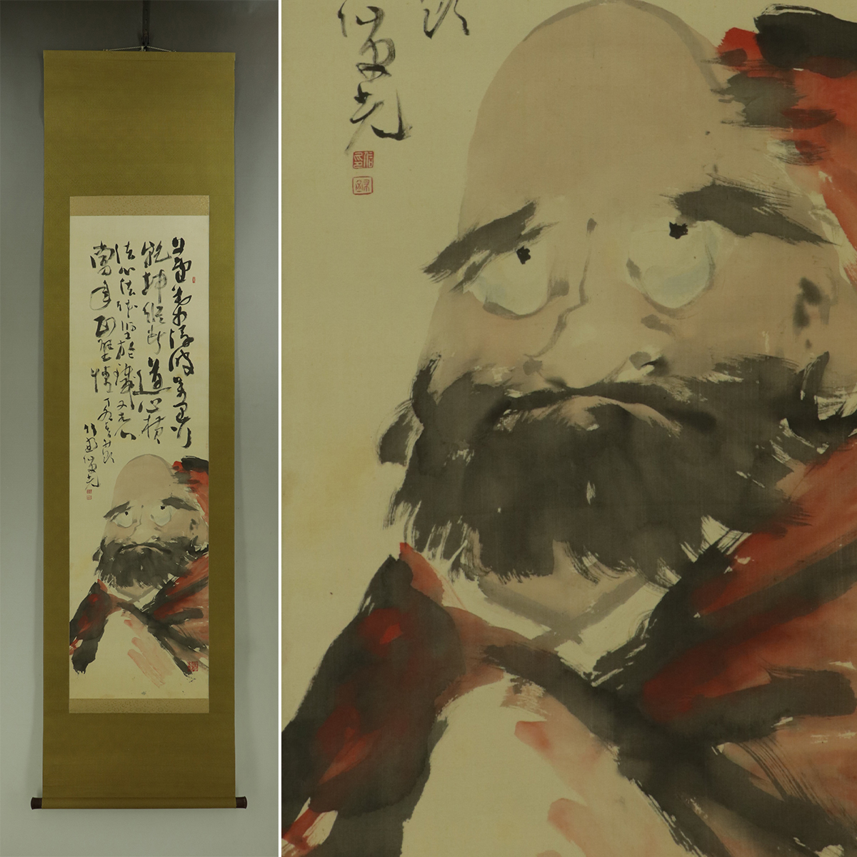- 【肉筆】竹窓銘【達磨図】◆絹本◆共箱◆掛軸 u09030