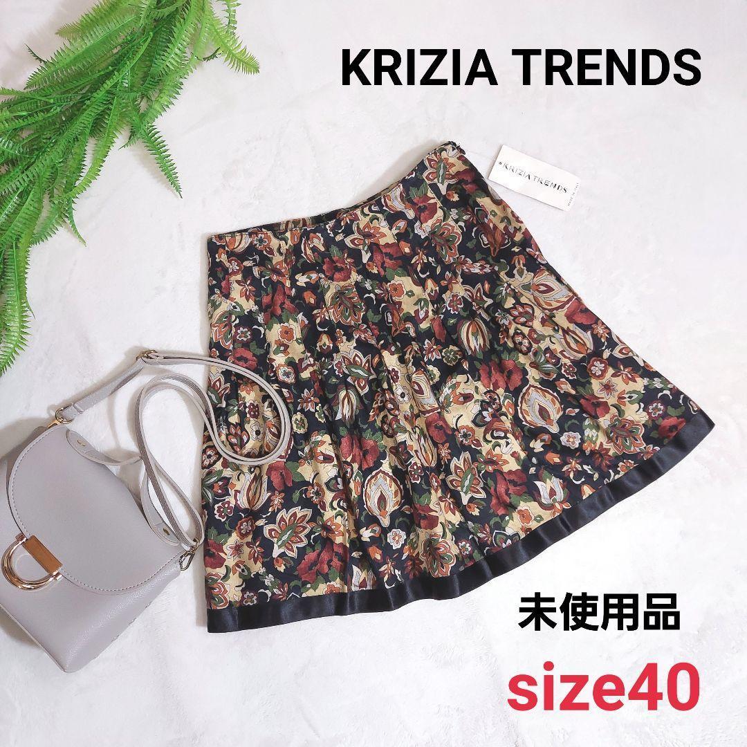 - 未使用品 KRIZIA TRENDS エスニック風フラワー柄 フレアスカート 膝上 表記サイズ40 L 花柄 黒ベース ベージュ赤茶オフホワイト緑80308