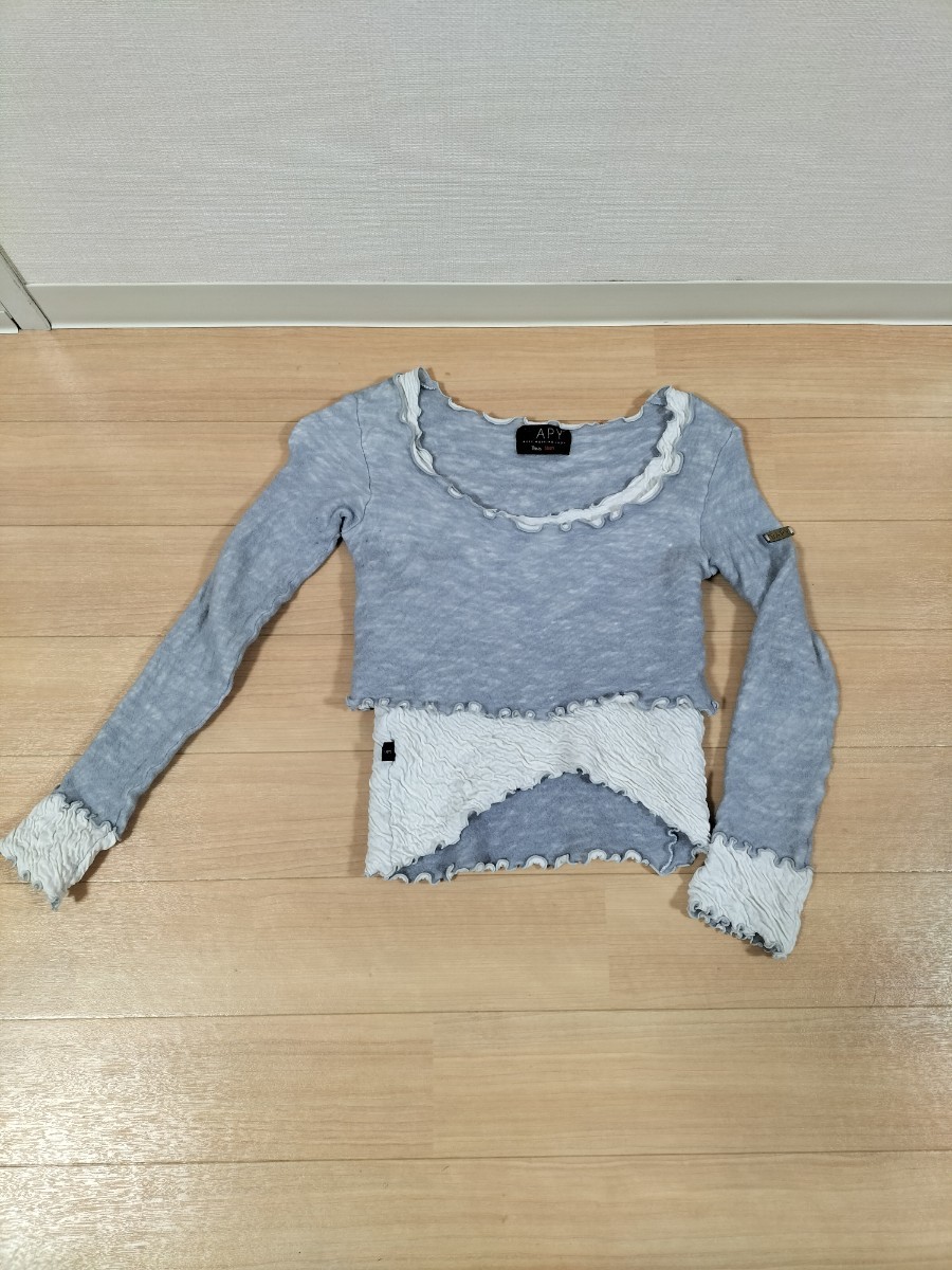 > BAPY ベイピー SHORTサイズ トップス 長袖 ※縮んで子供サイズ 難あり 日本製 重ね着風縮れ生地 COTTON&WOOL 青系