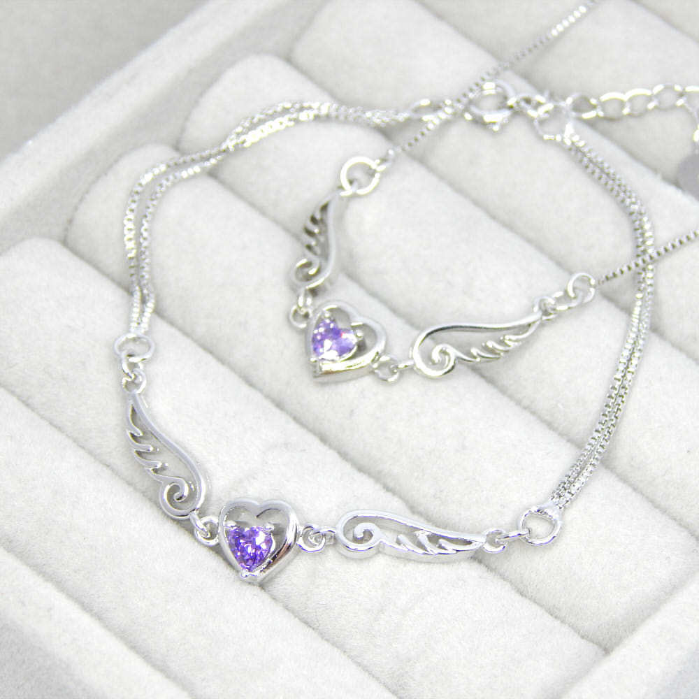 > 新品★送料無料 ハート天使 CZアメジストダイヤモンドネックレス&ブレスレット レディース ジルコニア シルバー925 プラチナ仕上