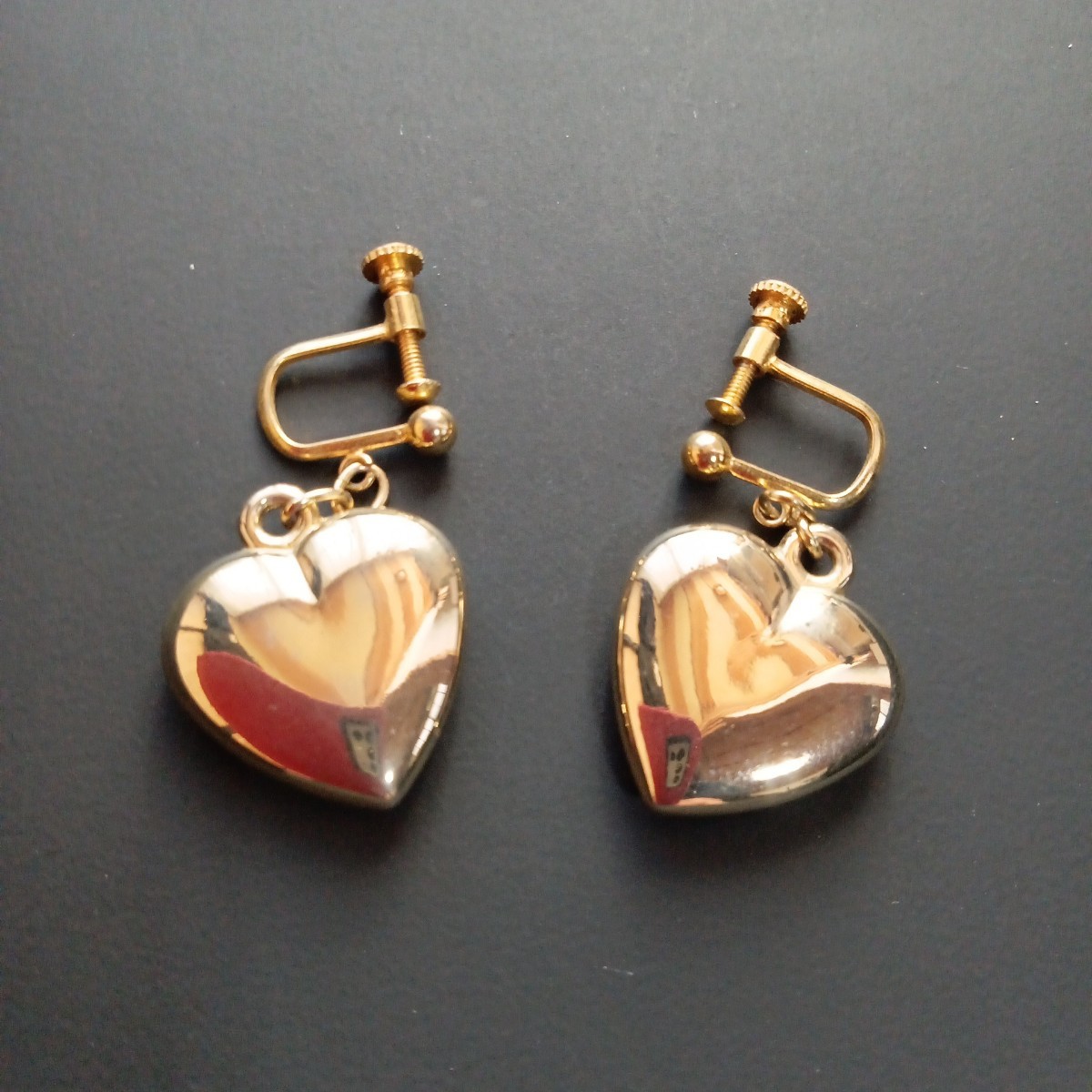 > ヴィンテージ ぷっくりハートモチーフの素敵なスイングイヤリング ゴールドカラー アクセサリー ビンテージ ゴールド 金 立体 ネジ