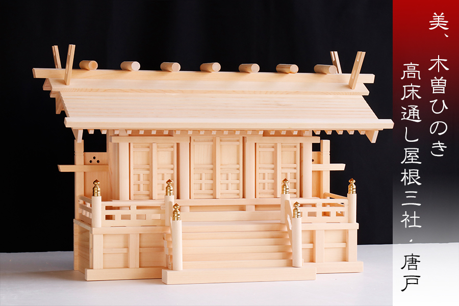 - 神棚 三社 単品 通し屋根 鹿屋野三社 最高級 高床通し屋根三社 唐戸 美・木曽ひのき 木曽檜 木曽桧