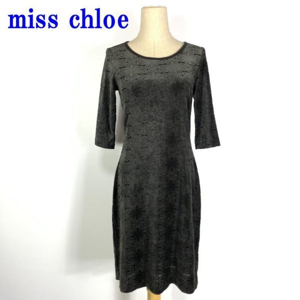 > ミスクロエベロアフラワーモチーフ5分袖フレアワンピースブラック系miss chloe カジュアル 裏地無 透け感有 ストレッチ有40 C8345