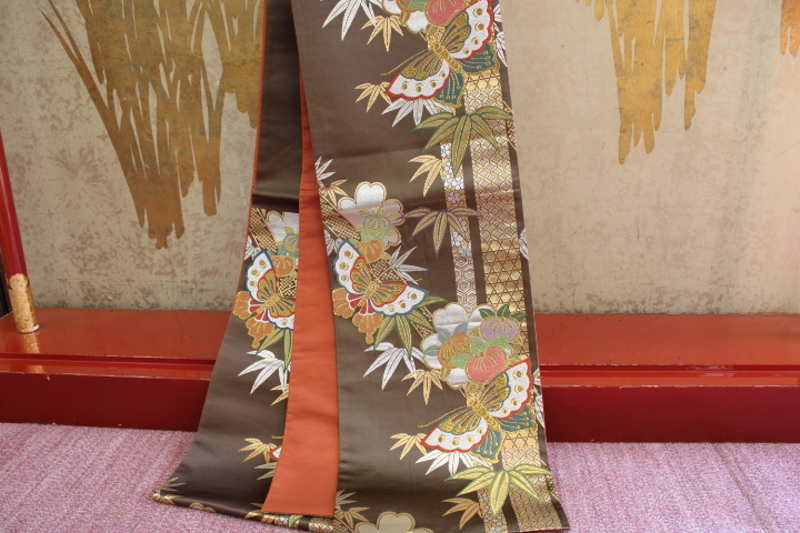 > きもの今昔6373 袋帯 西陣織正絹 濃い抹茶色地に金の小紋様の片縞に、笹、蝶、橘の花の美しい模様