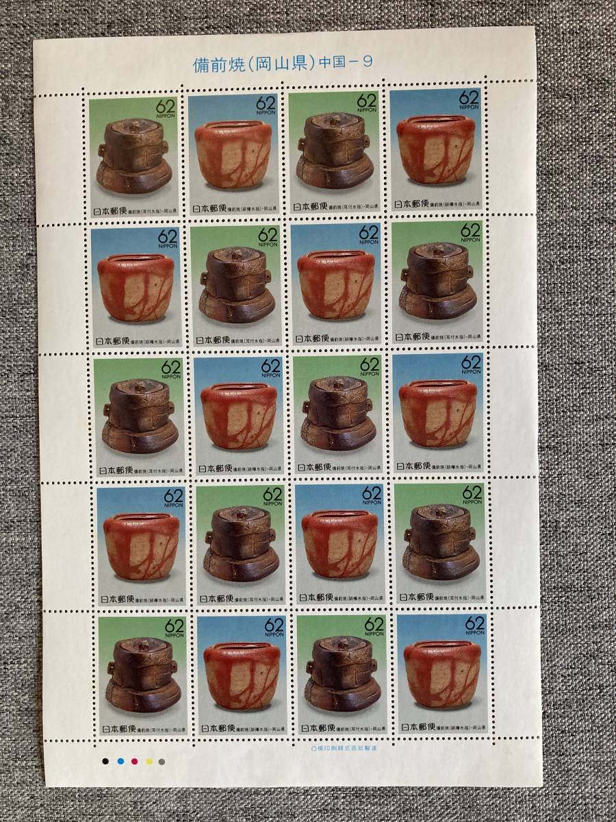 > ★未使用 ふるさと切手 備前焼 岡山県 中国-9 中国地方 緋禅水指 耳付水指 平成3年 1991年 シート 62円20枚
