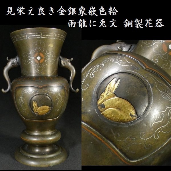 【 恵 #0988 】 金銀象嵌緒の美しい一品 兎に雨龍文 龍耳 銅製 花瓶 細工の見事な飾り栄え抜群の一品です拍卖