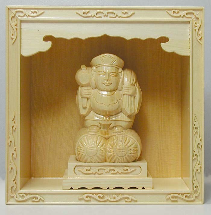 - 総檜(ひのき) 手彫り「升大黒天」置物