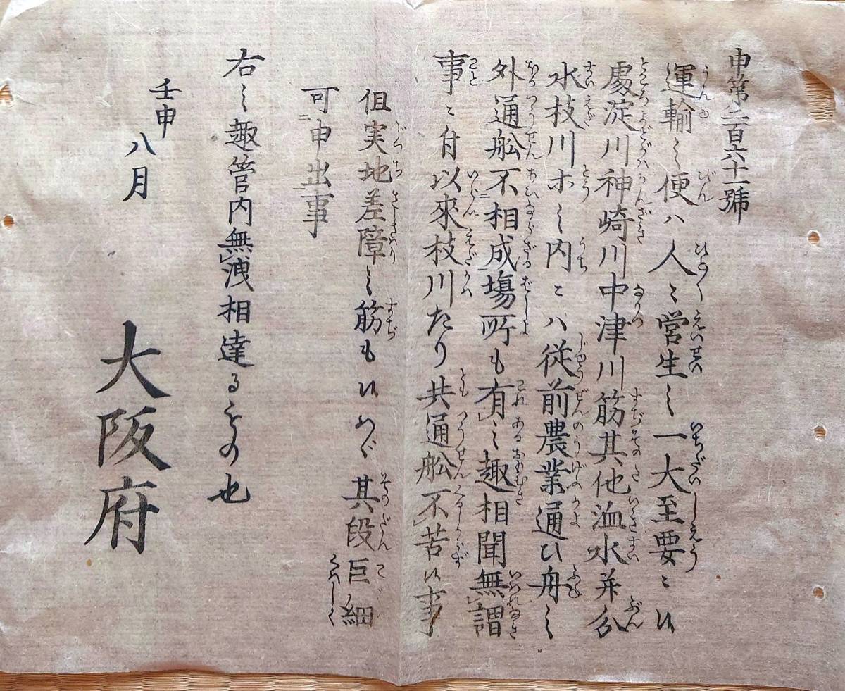 - f23022628〇明治布告布達 明治5年 運輸の便 淀川神崎川中津川 共通船苦しからず候事 大阪府〇和本古書古文書
