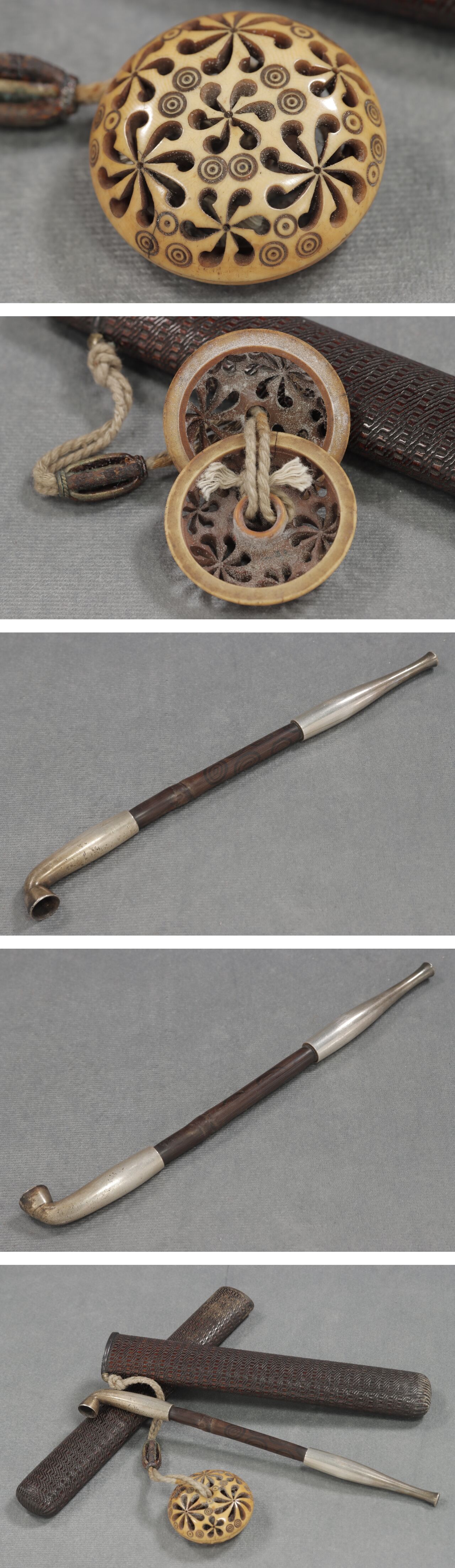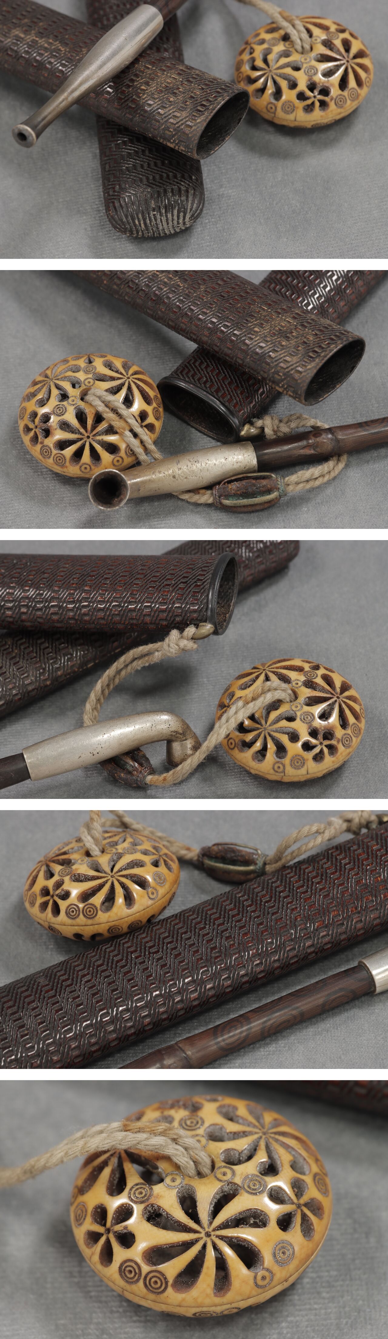 - 天地堂《時代 喫煙具》細密竹編煙管入 竹編煙草入 煙管 キセル パイプ 根付 抹香 鯨歯 鹿角 河馬牙 動物骨 古竹 斑竹 紋竹 赤竹