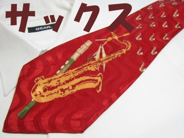 - 【音楽 テナーサックス フルート】NA627 サキソフォーン絵柄 ネクタイ 赤色 レトロネクタイ プリント